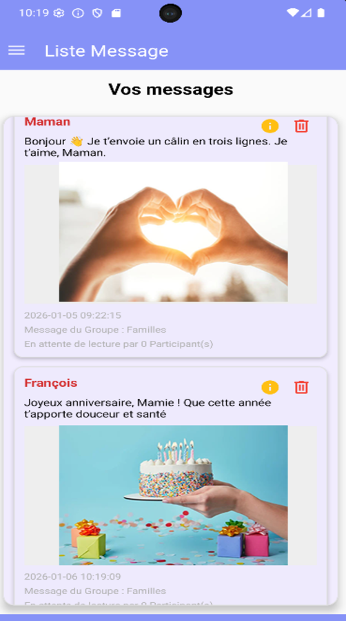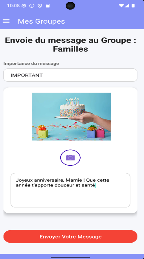 Depuis l’application mobile ou l’interface web, sélectionnez un groupe ou un proche, puis envoyez un message, une photo ou une vidéo.